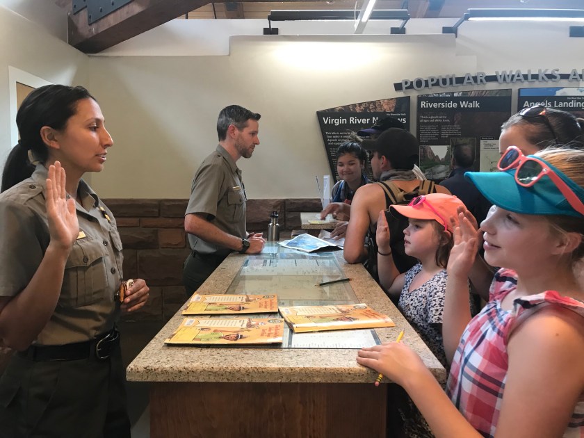 At every national park my sisters and I try to complete the junior ranger program. The junior ranger program is where kids get a packet to complete while they are at the national park. If they complete the packet they get a badge and are sworn into the park as a junior ranger. While we were at Zion National Park we were trying to complete our packets. As part of the packet we had to attend a ranger led program, but none of the offered classes fit into our schedule. As we were on our way back from one of our hikes we met a very nice ranger named Janice. She explained to us how the canyons were formed and how erosion played a big part in the shaping of the rock. She told us the story of a huge boulder named Bob and how he had come down onto the trail after a mudslide. After Janice had finished, she told us that our chat about erosion and rock formation had counted as a ranger led program. Because of her we earned our Zion badge!