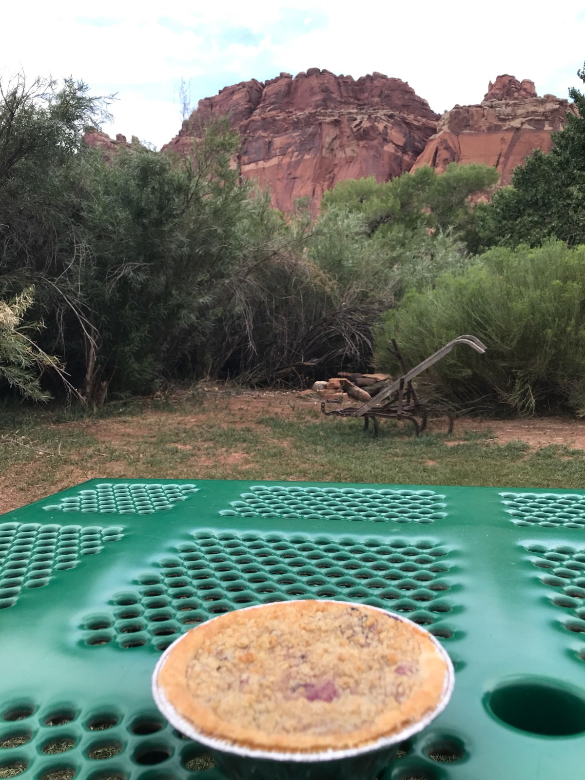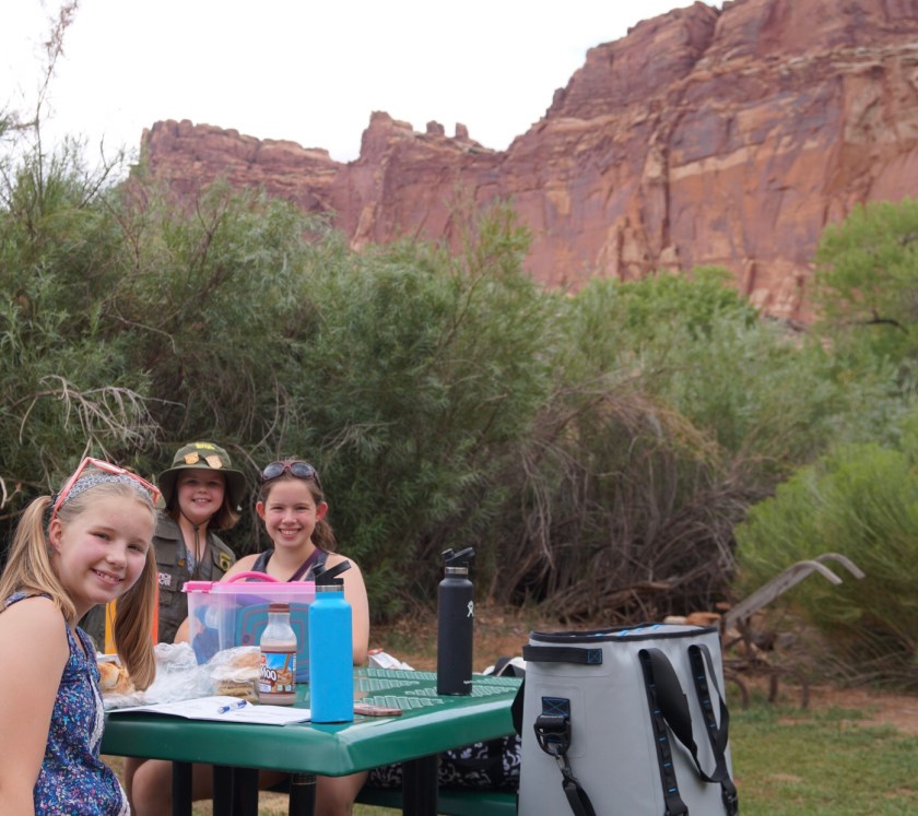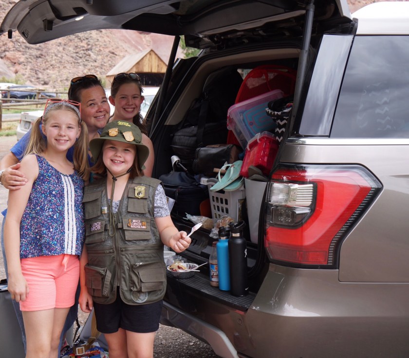 - Travel kitchen: this has been the best! Although we’ve had over 30 meals on the road, we’ve only had fastfood drive thru twice. Taking advantage of free hotel breakfasts and having a cooler we keep cold each day from ice at the hotels has helped immensely. We’ve stopped at markets and purchased cheeses and meats, fruits and veggies. We’ve even picked fruit in a National Park! Some of my favorite moments have been picnic meals wherever we are. Having the travel kitchen means we have plates, utensils, a knife and cutting board wherever we go.