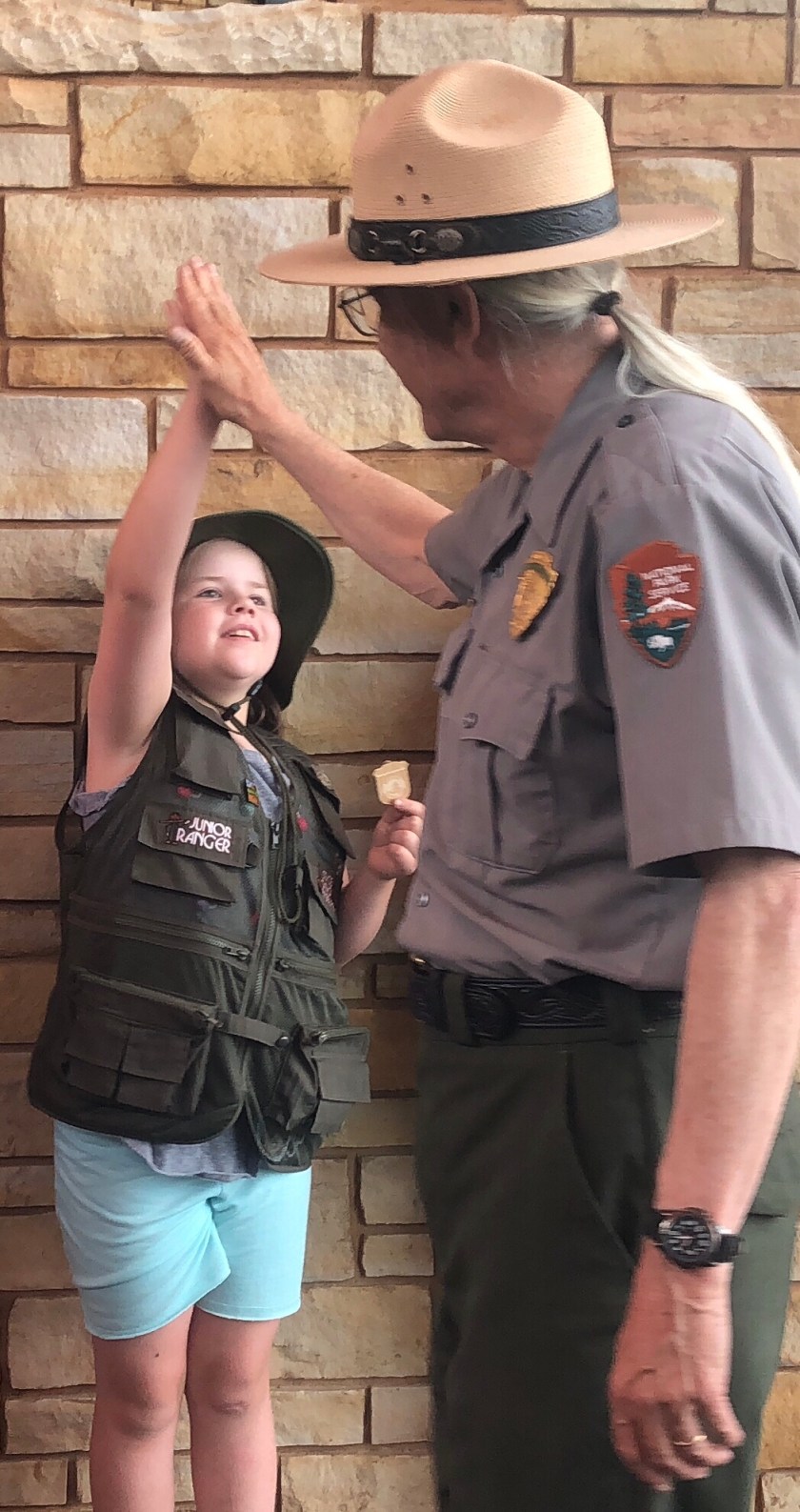 At each National Park or historical site, my sisters and I do the Jr Ranger program. We get a little book and if we finish the book we get a Jr Ranger badge. So far we have gotten 12 badges on this trip. The books have activities and challenges to complete. I like the drawing pages and the crosswords the best. Sometimes we have to go to a Ranger program and learn about one small piece of the park. My favorite ranger talk was with a ranger in Zion National Park. She taught me about Bob the Boulder who broke off a cliff during a heavy rain.